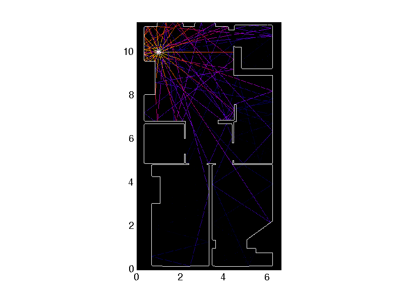 Now, I choose a position for the router and this is the starting position for a set of rays. They propagate in straight lines until they reach a wall – reaching a part of the image of the flat where ‘wall == 1’ – and they are reflected according to