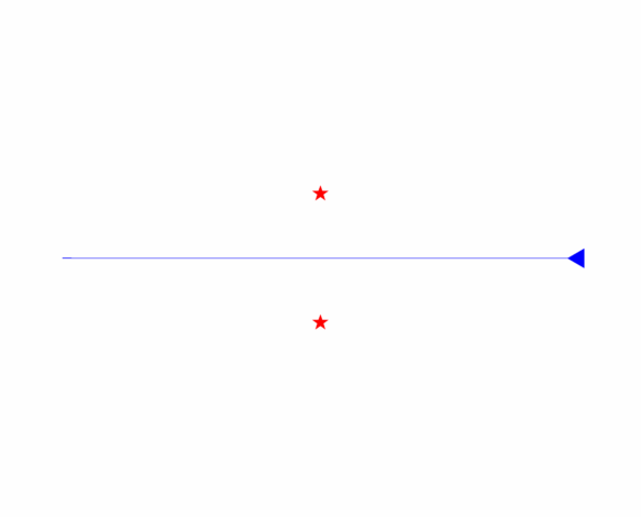 . Red stars mark the black hole positions, and the triangle is the starting position of the particle.