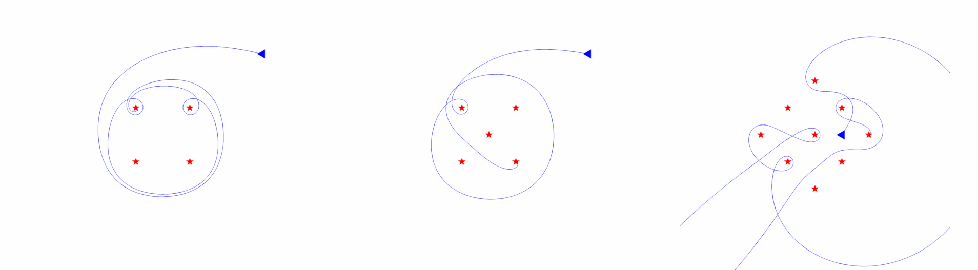 Again, unsurprisingly, it is captured by the black hole nearest to it. Keeping it still in the top half of the plane, there are also trajectories like this one where the particle swoops round into the other black hole.