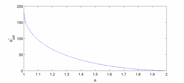 This function is plotted below, and looks like it makes sense. For the deflection is 0, the ray just bounces straight back no matter what the refractive index. For all