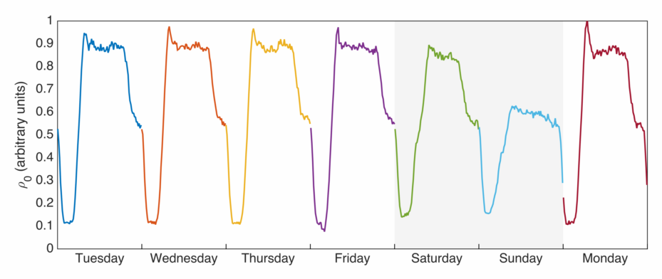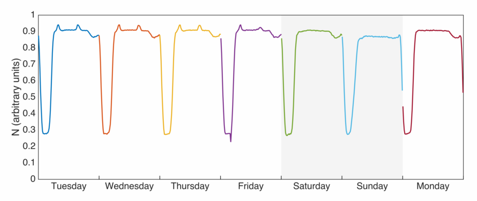 Now, what does this look like over the course of a week? Plotted below are the same data over the entire interval I was recording, with the weekend highlighted grey.