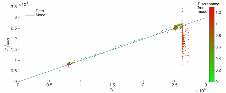 I’ve plotted these two quantities below, coloured by how well that particular dataset fitted an exponential model (proportional to the value):