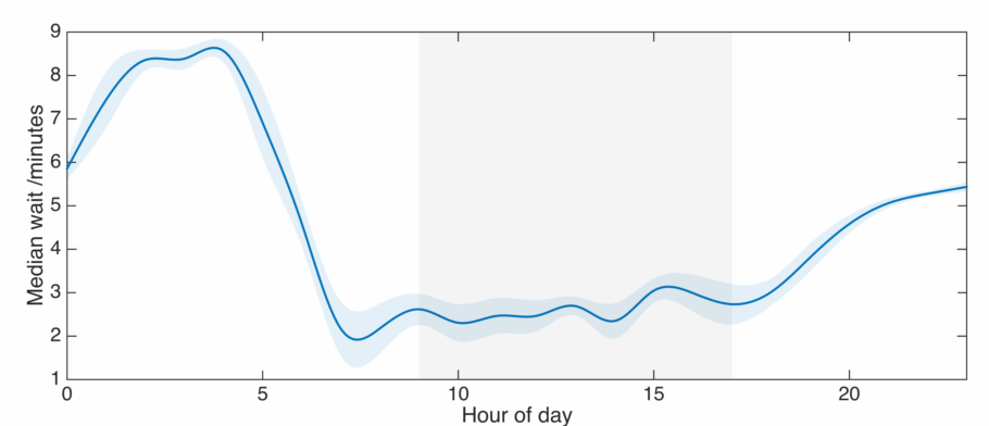 First lets see what this data actually looks like. We’re interested in how long we have to wait for a bus, so how does this vary during the working day? Plotted below are the median waiting times averaged across a working week, with 9am-5pm highlighted in grey.