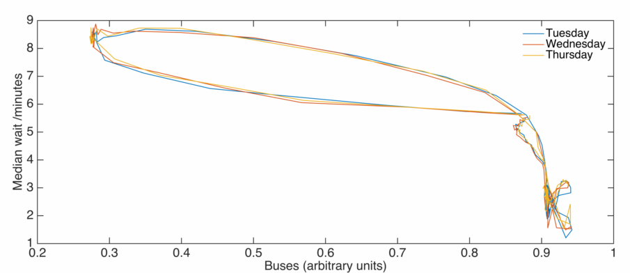 You’ll notice there are a number of obvious loops in the plot, and this is a mark of hysteresis – the response of a system to an input depending upon the path we take to arrive at that input. In this case the system is the London bus network, the input is the number of buses being forced into this network, and the response is the average waiting time for a bus.