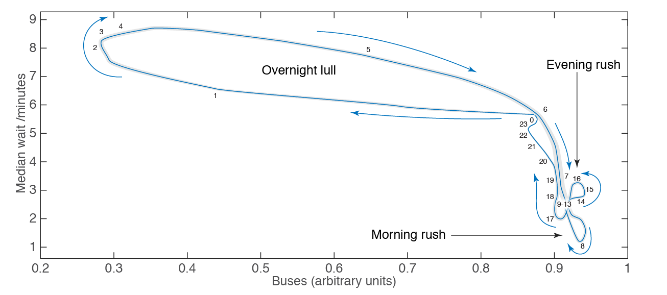 You can think of this as a ‘bus phase space’ which the system walks through each day, in a remarkably stable way from day to day. We start at midnight – zero on the plot. From here the number of buses rapidly decreases – moving to the left. However the average wait time doesn’t change hugely. In the small hours of the night we reach a minimum in the number of buses, with a sharp rise in the wait time. As the sun rises the number of buses rapidly increases, but the wait time is slow to respond, until approximately 6am when the wait rapidly decreases to a minimum near 8am.