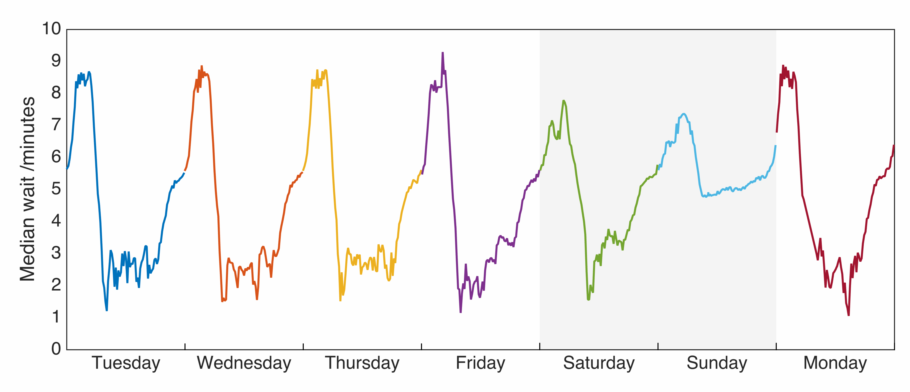 Wait times are a minimum in the morning rush hour, then stay low till around 7pm. They slowly increase in the evening, with a rapid jump after midnight. In London, this is when the schedules switch to the night time service. In the wee hours of the morning you should expect to wait around 10 minutes for a bus, but that’s as bad as it gets. Waiting times are very similar for all weekdays, especially in the evening.