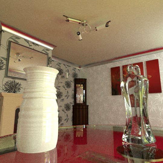 Taking the full outer isosurface from above, I decided it looked a bit like a vase. It would be trivial for an owner of a 3D printer to print out one of these, and might make for an interesting conversation piece? Perhaps you could print the isosurface corresponding to an image of your own face? As for what it would look like sat on your dining room table, fortunately I had a .blend file lying around just for such a purpose: