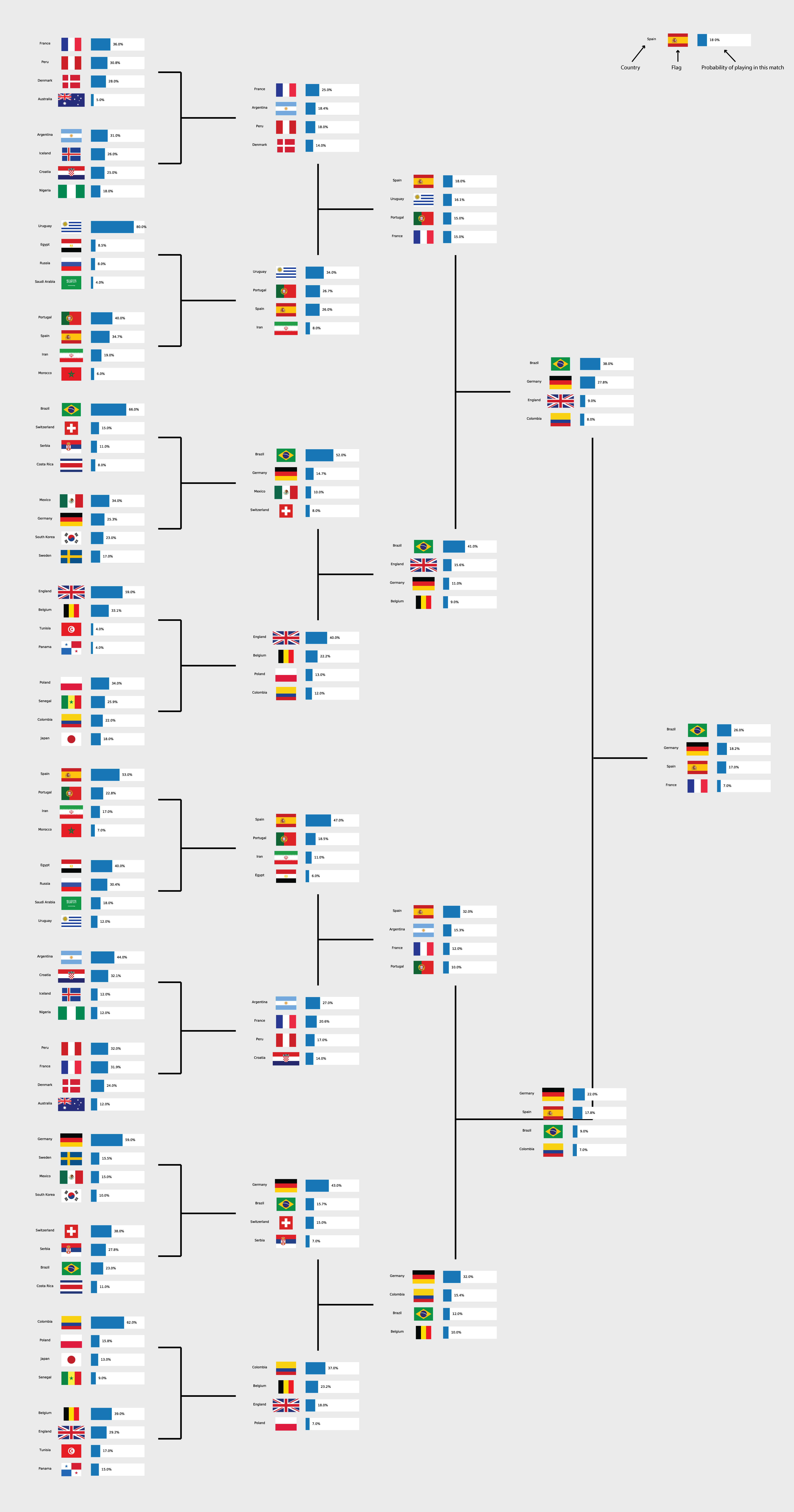 Of course, I have the entire world cup simulated so there is lots more detail to extract. In the following large image, I have plotted the probabilities that the given countries will participate in each match (click to enlarge):