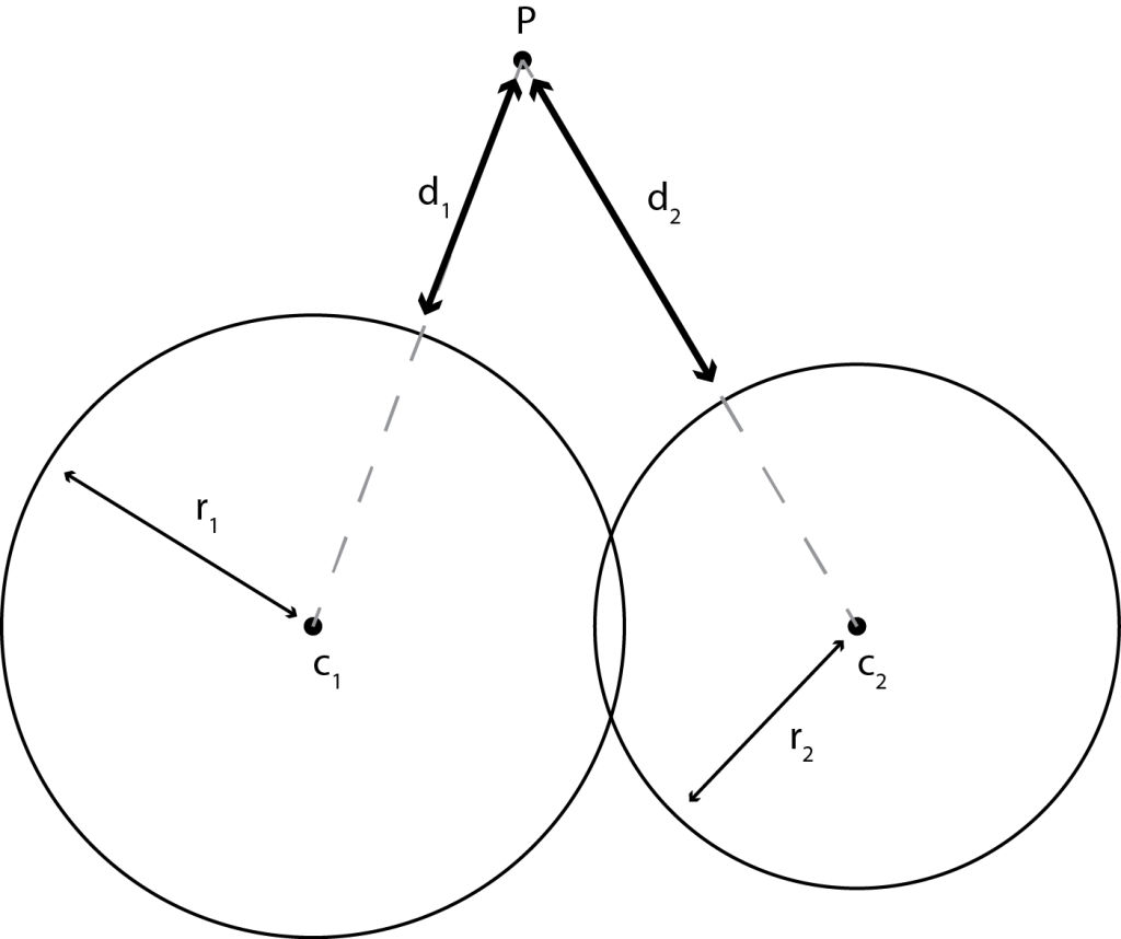 Consider an object made of two, overlapping circles, with radii and centres subscripted with 1 and 2: