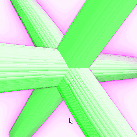 The surface representing SDF = 0 is coloured a tasteful green. The intensity of the magenta surrounding the edges correponds to the number of ray-marching steps required for each pixel – up to 50 are attempted. The reason that the number of steps goes up near the edges is due to the fact that marching parallel to the surface is extra expensive, as the maximum allowed step size is small: