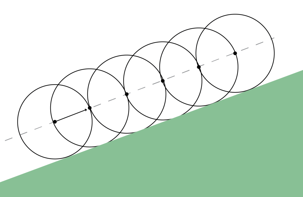 In the diagram below, we begin at the left heading along the ray indicated by the dotted line. The SDF is represented by the green circle.