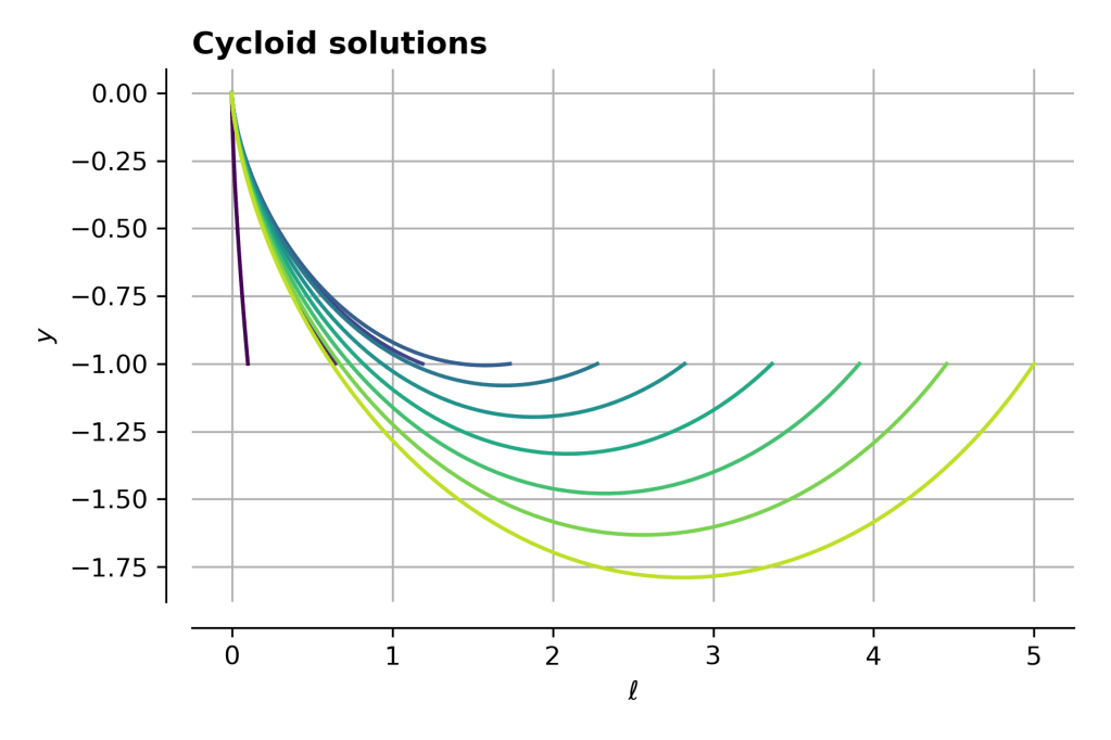 Fortunately for us, this problem was solved back in 1696 by such cheese-hungry greats as Newton, Leibniz, and all the Bernoullis, and is known as the brachistochrone problem – what curve would a frictionless bead slide down the quickest? (Assuming fixed start and end positions).