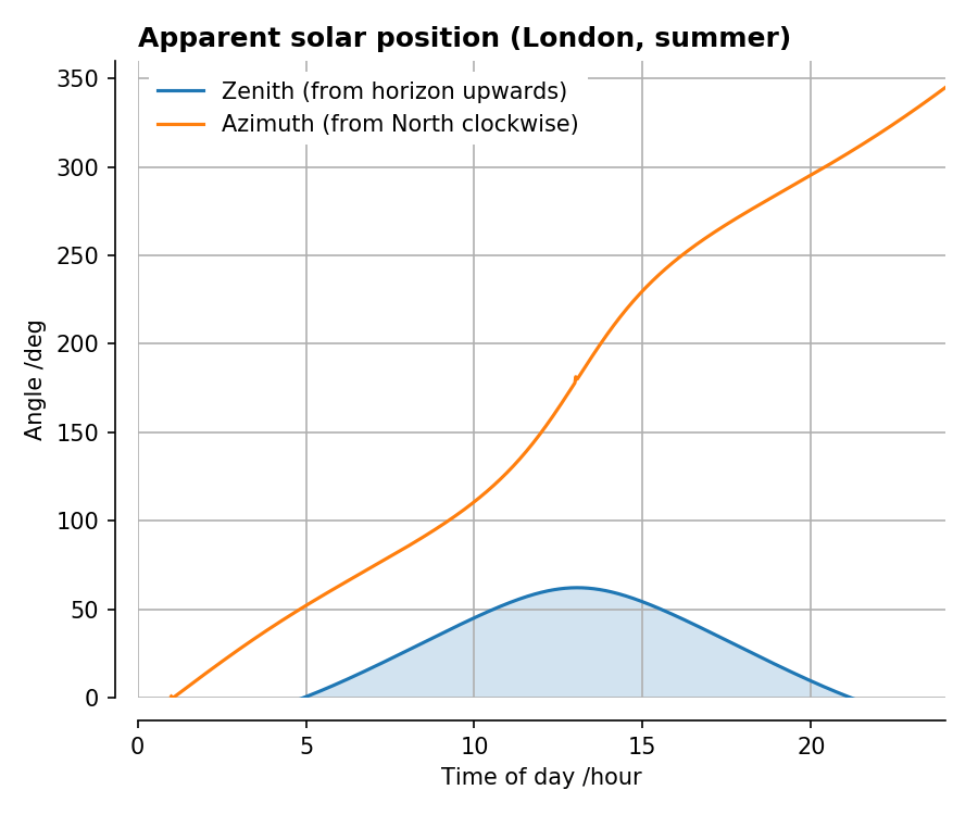 The above plot shows the solar position for London during the summer solstice – it rises around 5AM and sets around 9PM, reaching a maximum height (zenith) of around 60 degrees. At noon the sun is due south (at an angle of 180 degrees) and swings from East to West throughout the day.
