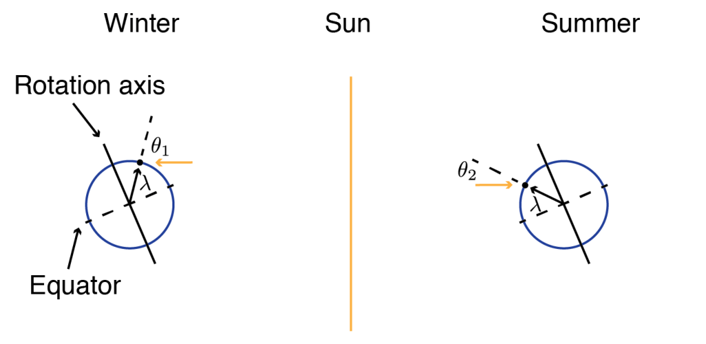 To see why this makes a difference, consider the diagram below. Solar rays arrive at an angle , and an incoming ‘chunk’ of rays spread over some distance