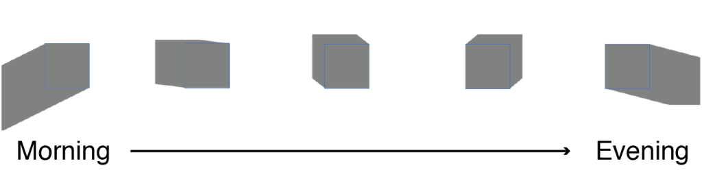 Right, let’s crack on. Using the app I mentioned above, the shadows projected by a square block (in London, at the summer solstice) vary throughout the day as follows: