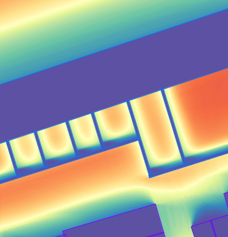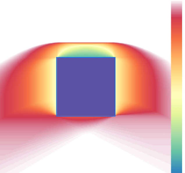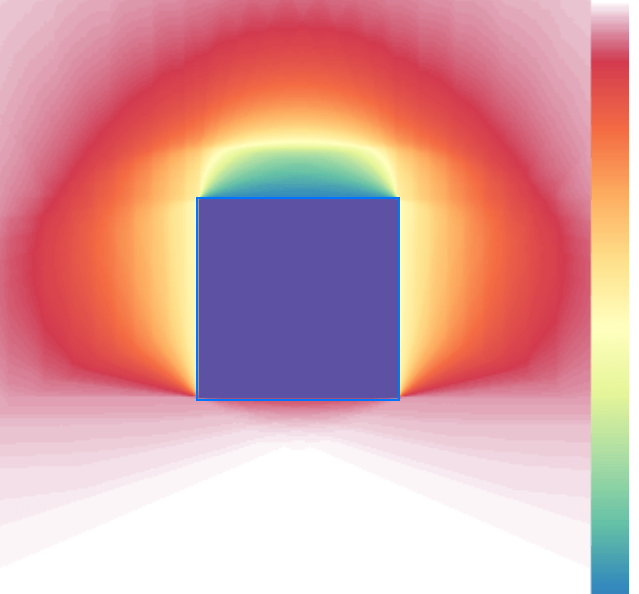 While the block casts a shadow at some point over much of the ground nearby (bottom), during the peak of the day around noon the shadow is minimised, and so the map weighted by irradiance (top) is less widely spread.