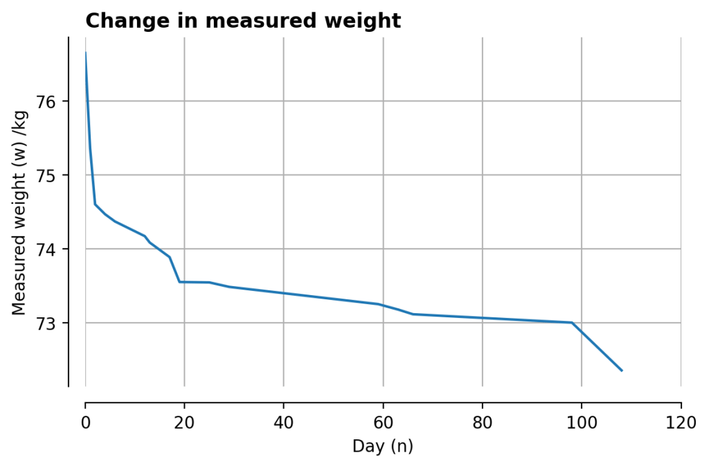 Here we’ve simulated the measurement process – every day, draw a sample from , and if it is low enough, accept it and plot it. It looks great – this hypothetical human has lost several kilograms in just a few months!