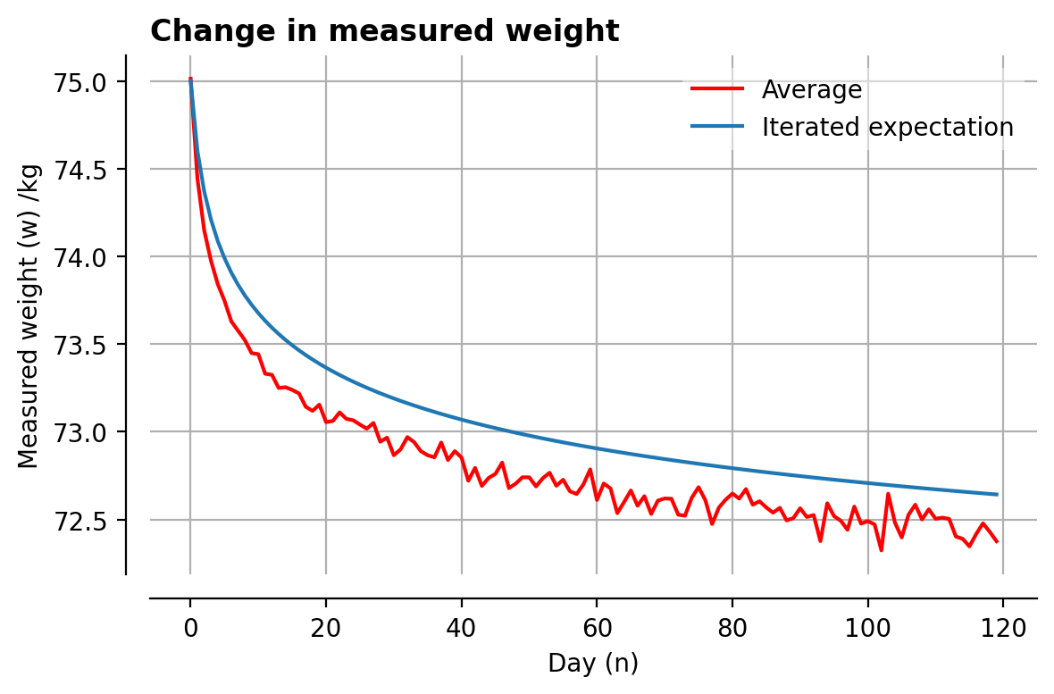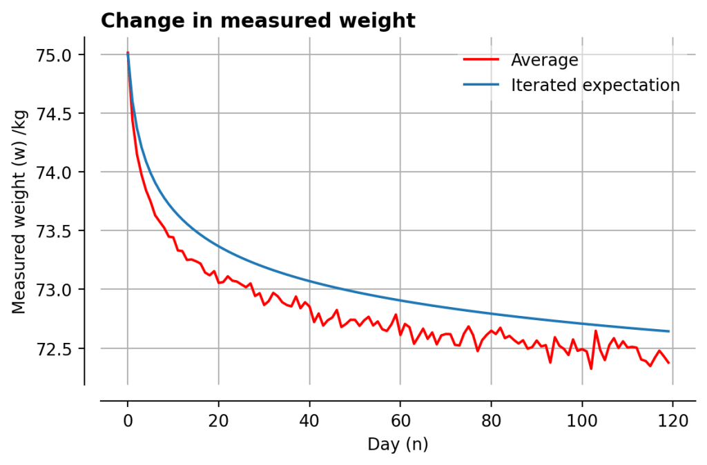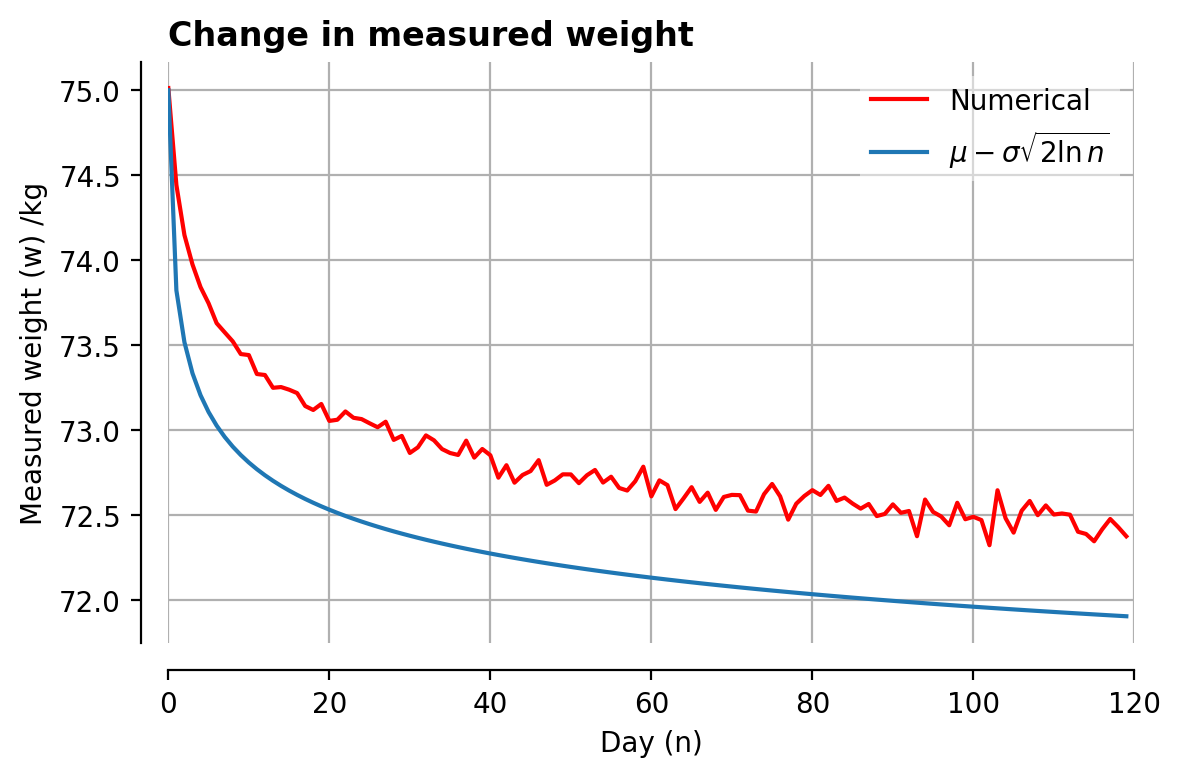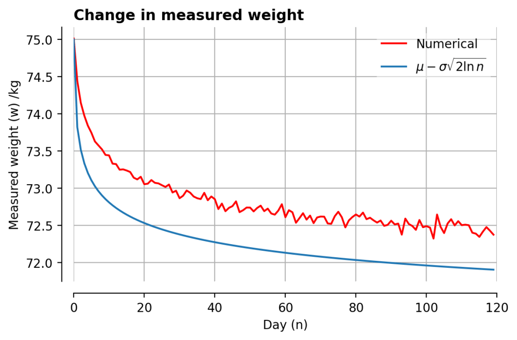 There is another, simpler, way to look at this problem: after days, the average weight recorded will just be the minimum of all of the measurements so far. Fortunately, there’s a generic way to calculate the distribution of this minimum.