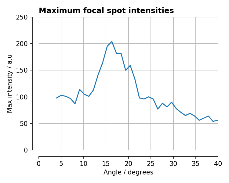 If we plot the maximum intensity of the focal spot as a function of ray angle, there is a clear peak: