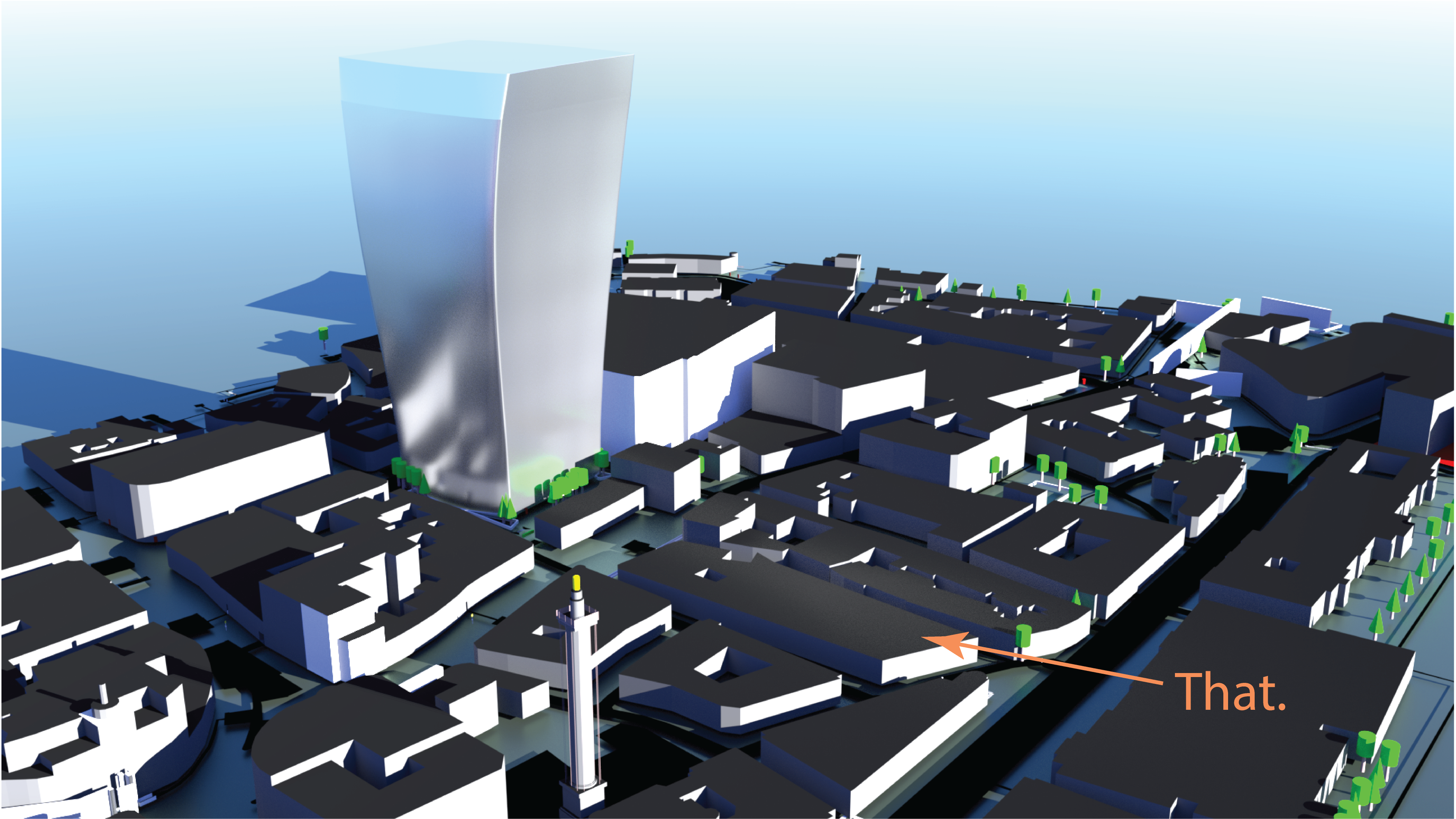 A bit of modelling, importing, and rendering later, we get a lovely view of this chunk of the City, with some minimal external lighting:
